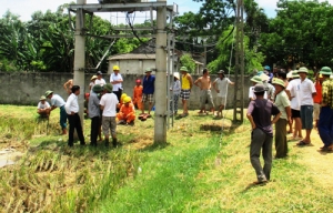 Khi nhóm cán bộ, công nhân điện lực đến hiện trường, rất đông người dân tụ tập la ó phản ứng, yêu cầu doanh nghiệp chịu trách nhiệm bồi thường. Theo ông Lê Xô Viết (trú tại thôn 10, xã Hợp Thắng), trạm điện nói trên được xây dựng vào năm 2013, trên một góc ruộng của gia đình ông.